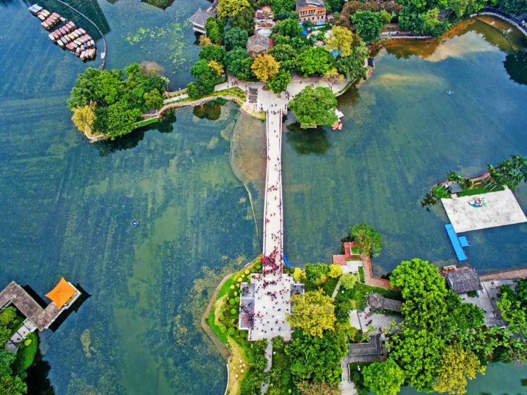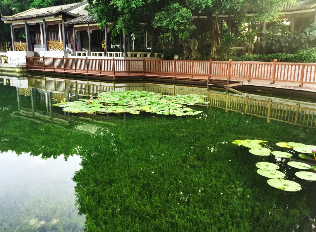 園區內綠草如茵,佳木蔥籠,曲橋臥波,層臺疊翠,荔灣八景詮釋著廣州的西關風情,重現古羊城的“荔灣漁唱”,貽水石橋,湖渡輝映,好一派南國風光。