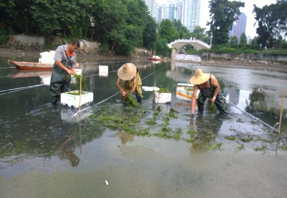 由于之前水體生態系統不健全,荔灣湖水生物多樣性較低,浮島植物及漂浮植物縱橫交錯;